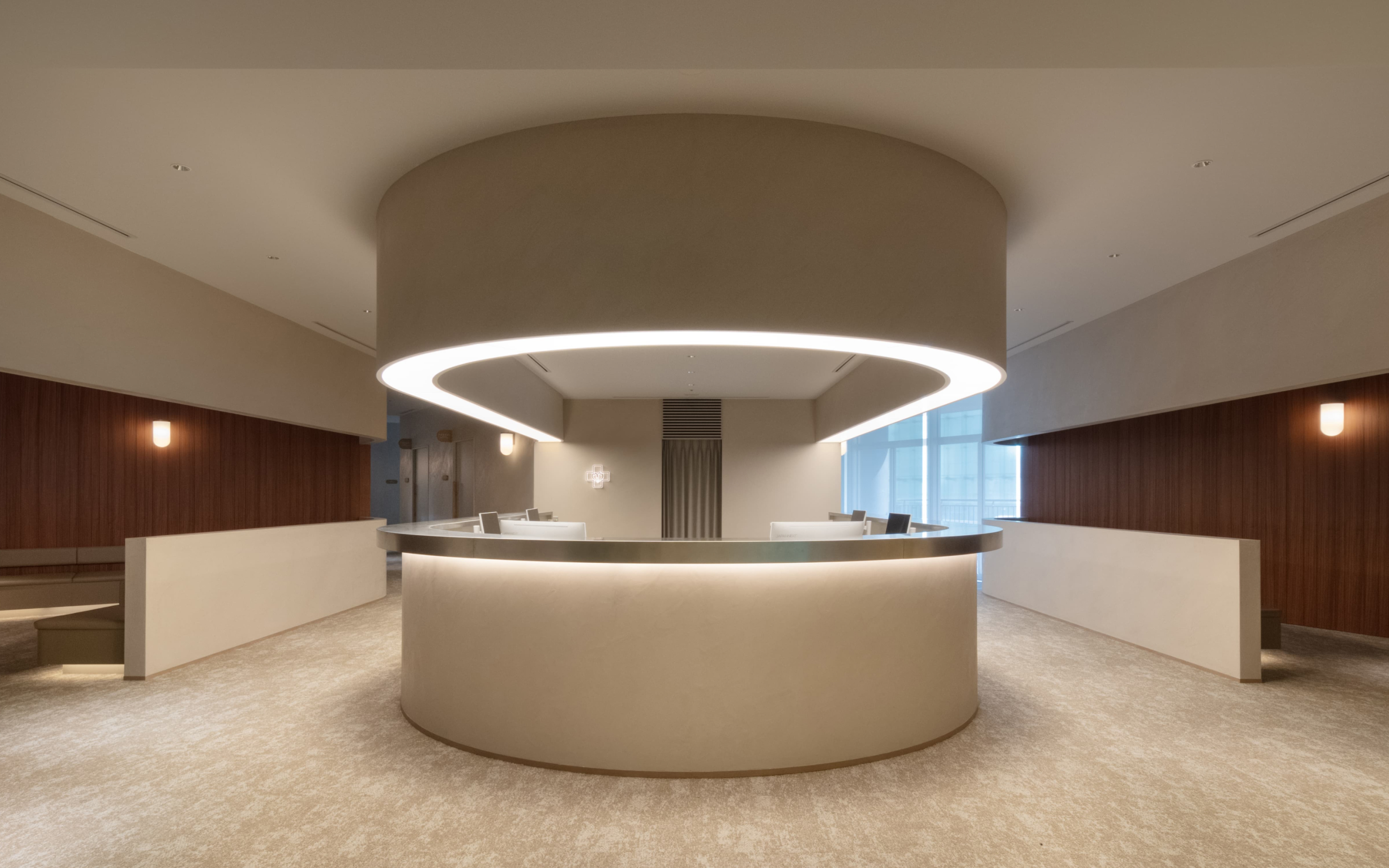- ひとつながりの有機的な左官壁で構成されている受付カウンター。柔らかな光とともに来訪者を迎え入れ、来院時の安心感を提供します。