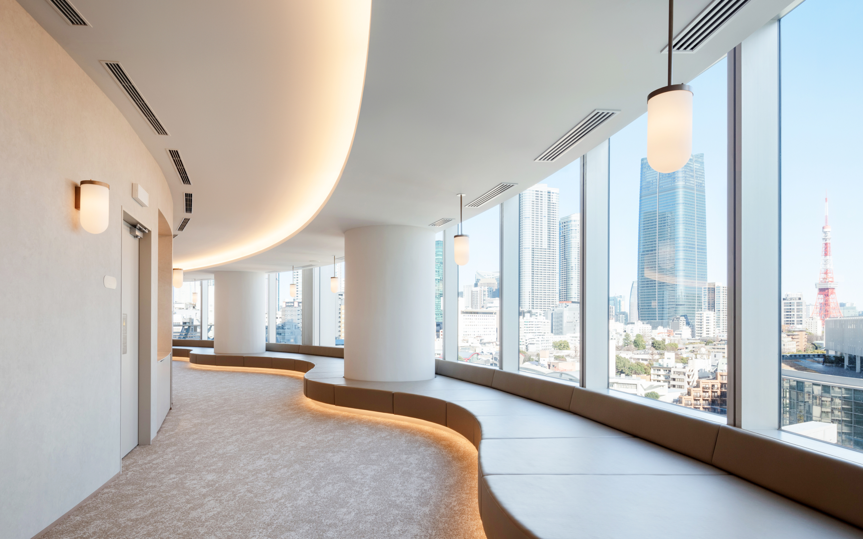- 放射状に広がる大窓から望む、東京のパノラマ。 眺望とともに、穏やかな時が流れる待合空間です。