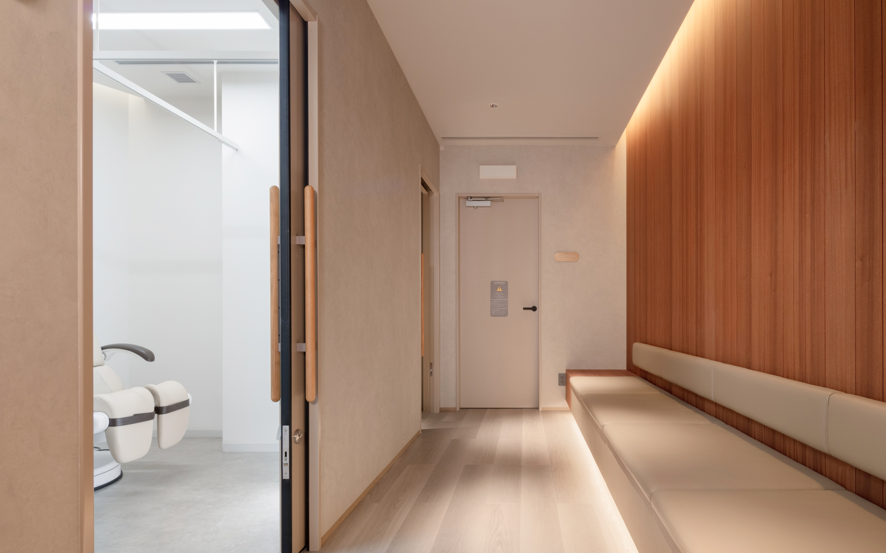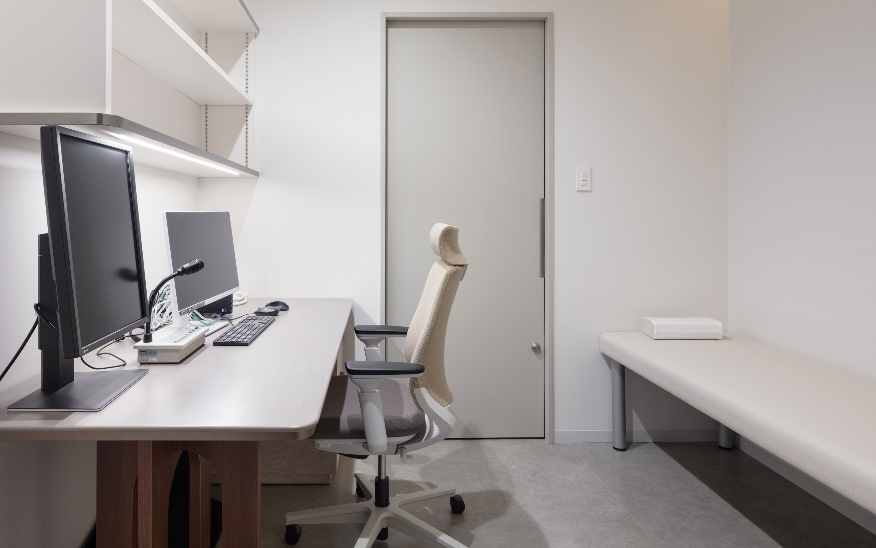 - 白を基調としながらも自然の素材感を取り入れ、緊張をやわらげるデザイン。十分な明るさとプライバシー性を確保し、医師との対話に集中できる空間を目指しました。