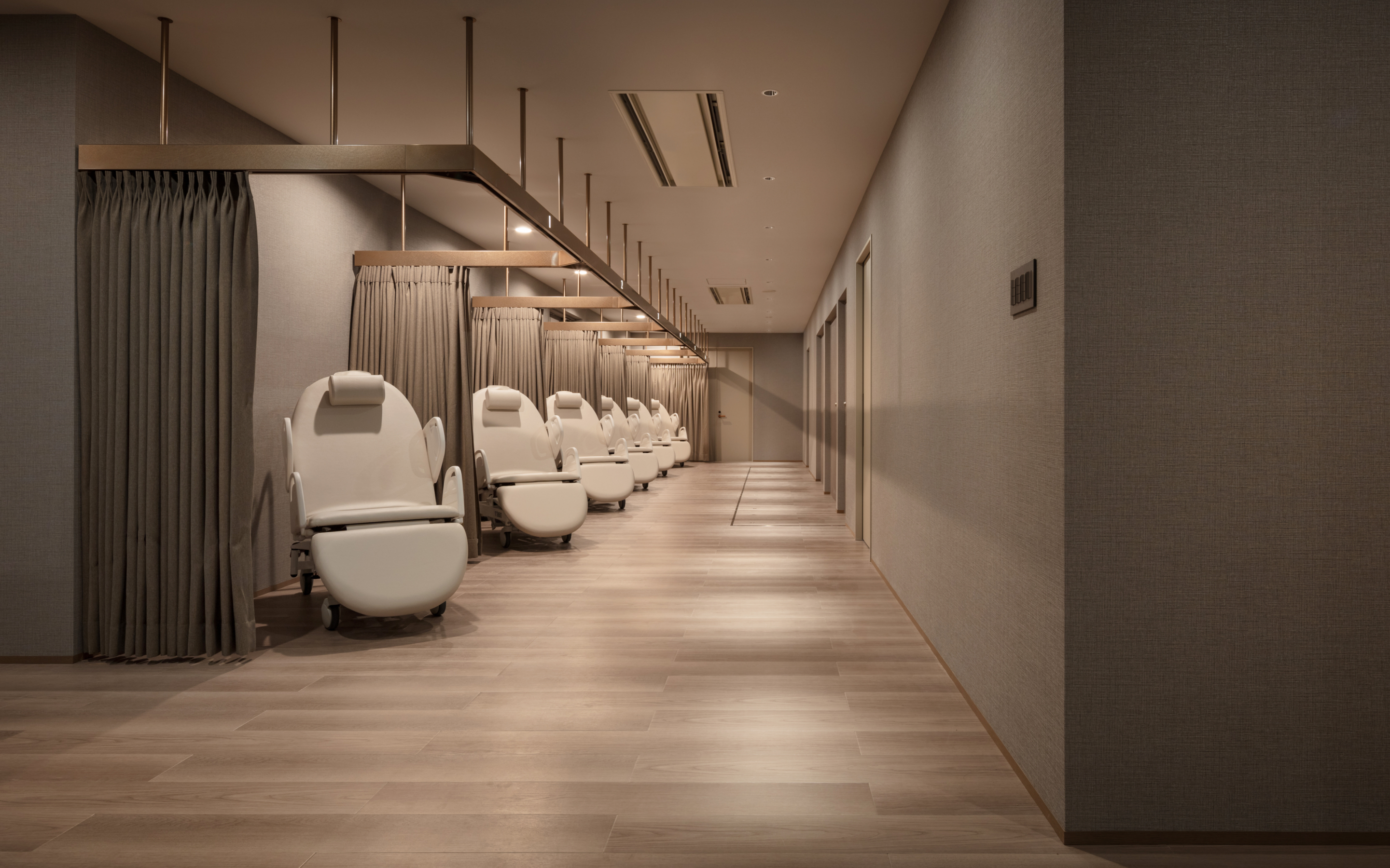 - やわらかな光とカーテンにより、プライバシー性と安心感を確保した、内視鏡待合空間。フルフラットにもなるベッドで、検査の前後の負担を軽減しています。